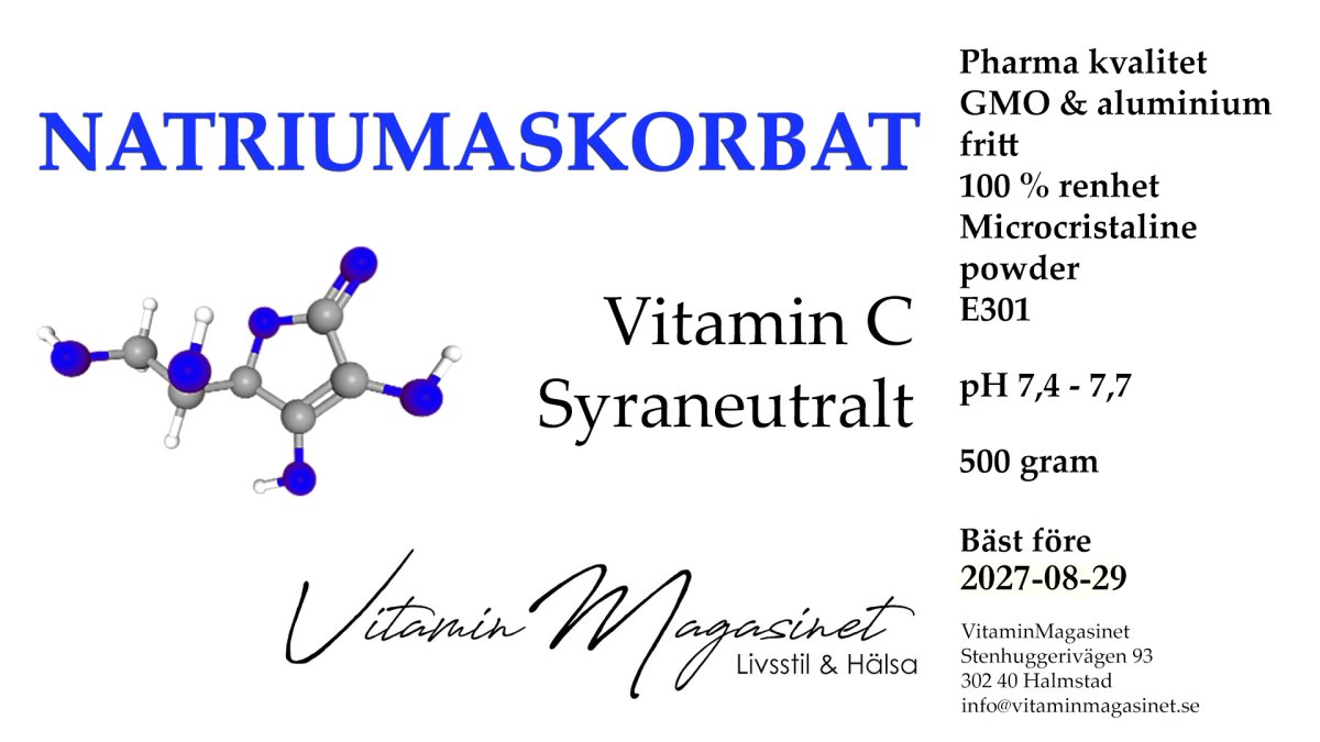 Natriumaskorbat C-Vitamin. GMO och Aluminium fritt, Syraneutralt, beställ 2 st x 500 gram av högsta kvalitet, (medicinsk) Pharma